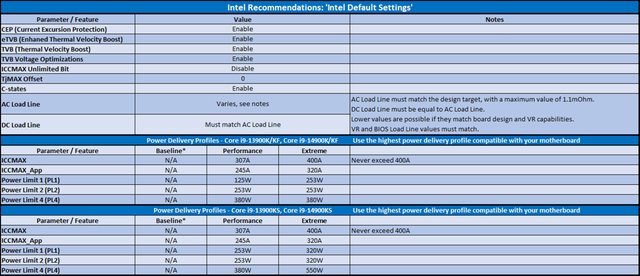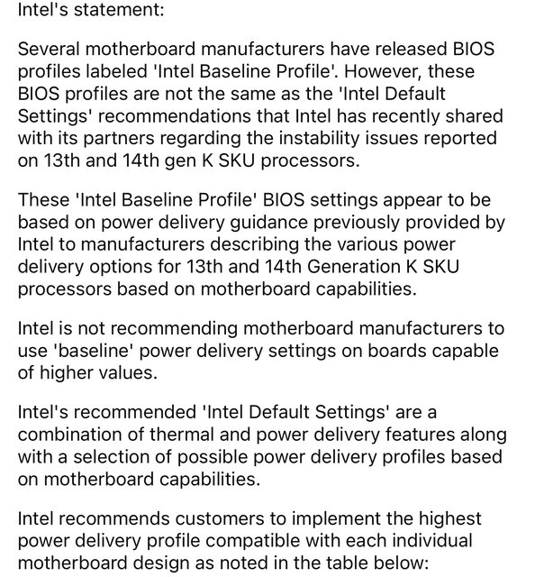 Intel 的聲明: 一些板廠已經發布了所謂「Intel 基準值」的 BIOS 配置。然而,這些 BIOS 配置與 Intel 最近與其合作夥伴共享的關於第 13 代和第 14 代 K 處理器不穩定性問題的「Intel 預設 值」建議並不相同。 這些「Intel 基準值」的 BIOS 設置似乎是基於 Intel 之前向板廠提供的有關第 13 代和 第 14 代 K 處理器的各種電源傳遞選項(power delivery)。 Intel 不建議板廠在具有更高值能力的主機板(Z)上使用「基準值」電源傳遞。 Intel 推薦的「Intel 預設值」是一種結合了熱和電源傳遞的組合,以及根據主板能力選擇 的可能的電源傳遞配置。 Intel 建議客戶根據下表中所示的每個單獨主機板配置: https://i.imgur.com/Y3tLxsg.png