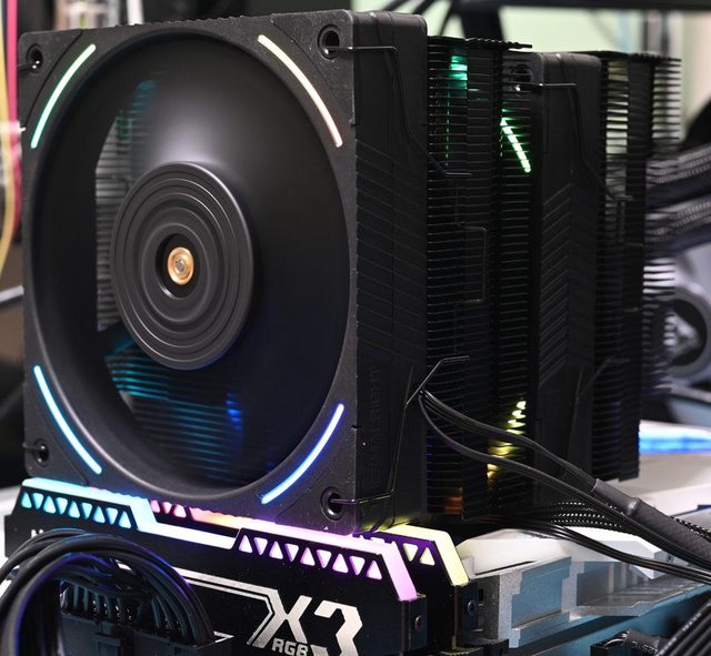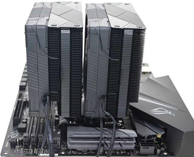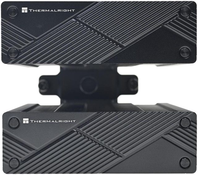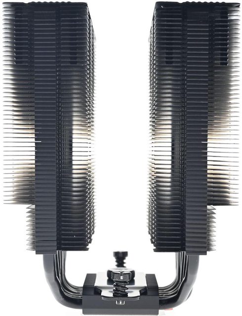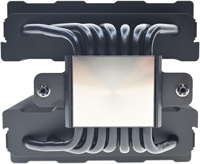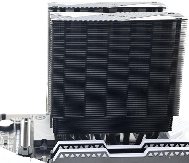 用焊接方式組合,搭配55層高密度鰭片,熱導管與鰭片均採黑化處理,頂部配置黑色裝飾