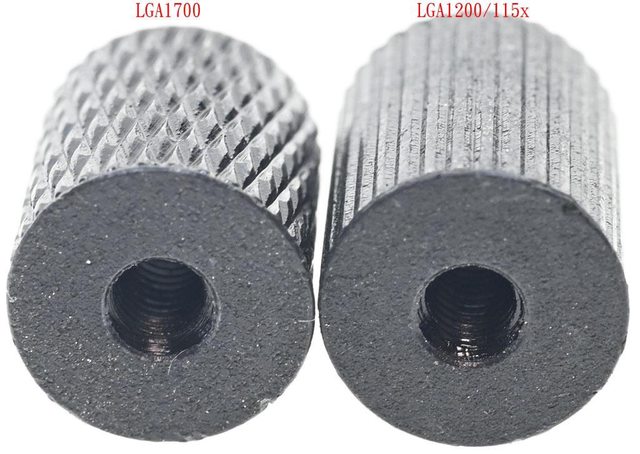 ▼LGA1700托架固定柱外觀為斜線壓花(左),LGA1200/115x托架固定柱外觀為直條紋溝槽(
