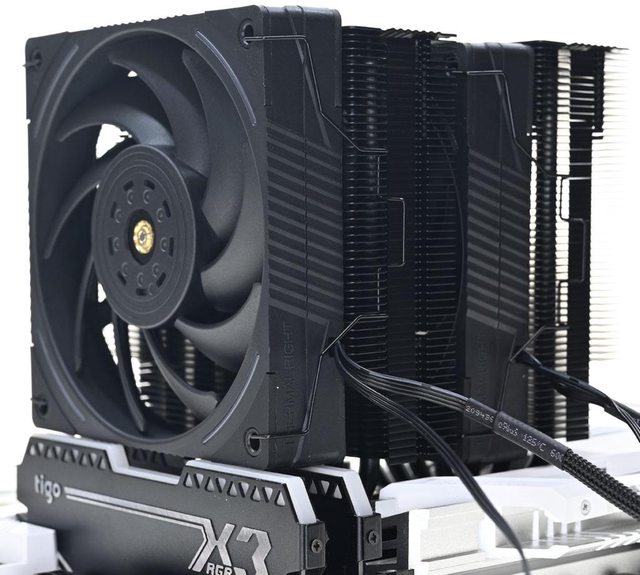 ▼散熱器本體採雙塔設計,黑化處理的熱導管及鰭片往右邊偏置,底座兩邊各伸出7支直