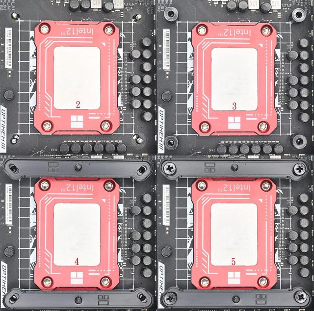 LGA1700托架固定柱有黑色墊片那面朝下鎖入固定螺牙(3),4個固定柱完全鎖入固定螺牙
