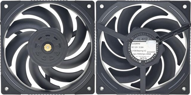 ▼2個TL-K12風扇,使用S-FDB V2軸承,9葉片鐮刀狀扇葉中央露出金屬軸心,外框中心銀