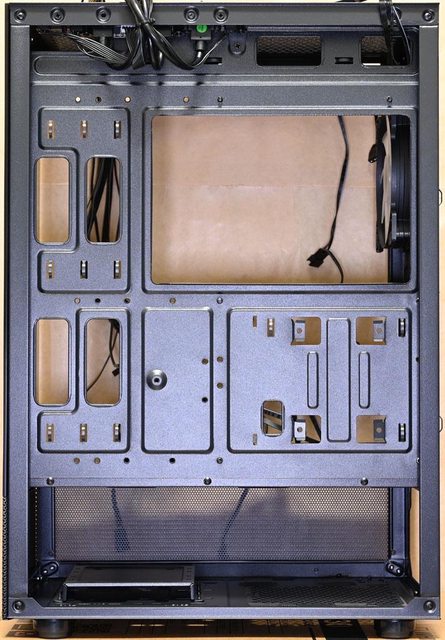 ▼後方預裝1個120mm ARGB主控風扇,主機板安裝底板上方鏤空,方便拆裝CPU散熱器背板