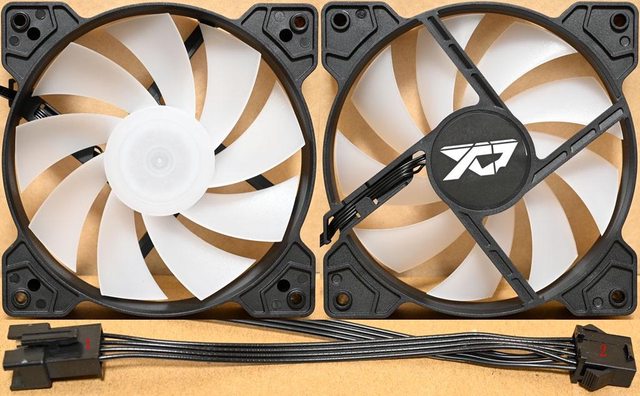 ▼120mm ARGB主控風扇,乳白色9葉片扇葉軸心內有發光LED,扇葉外框貼紙有商標,風扇
