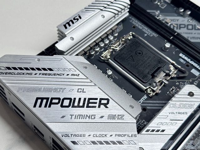 Z790 MPOWER主機板採用銀白風格散熱片,散熱片上以超頻常用詞如電壓、時脈、頻率、