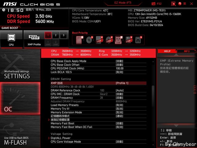 XMP 設定1為DDR5-8000,CL值為38-48-48-84,除了套用XMP設定外,微星MPOWER亦提供