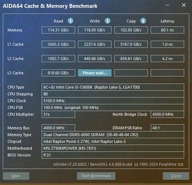 AIDA64的記憶體測試數據,讀取跟寫入大概都有115GB/s上下,延遲則是60ns上下。