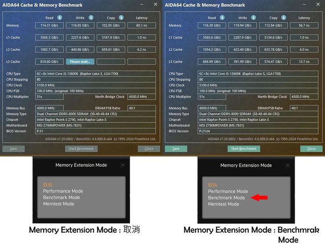 順便簡單比較一下開啟BIOS內Memory Extension Mode設定的差別,開啟後針對AIDA64的