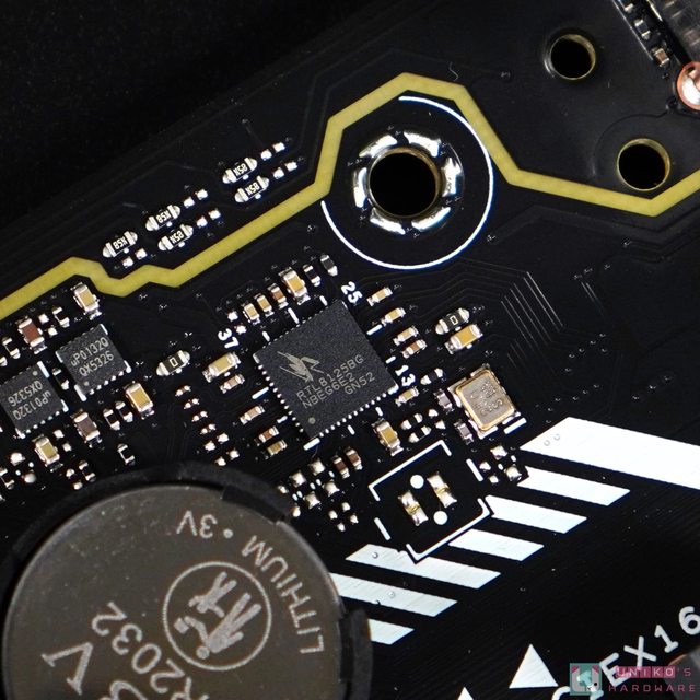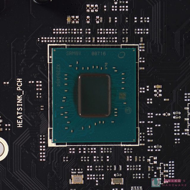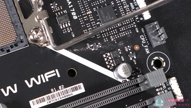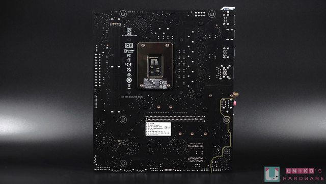 。CPU 插座中央的部份沒有太多 MLCC 小電容,下方的貼紙寫上 Wi-Fi 所使用的型號,MT7