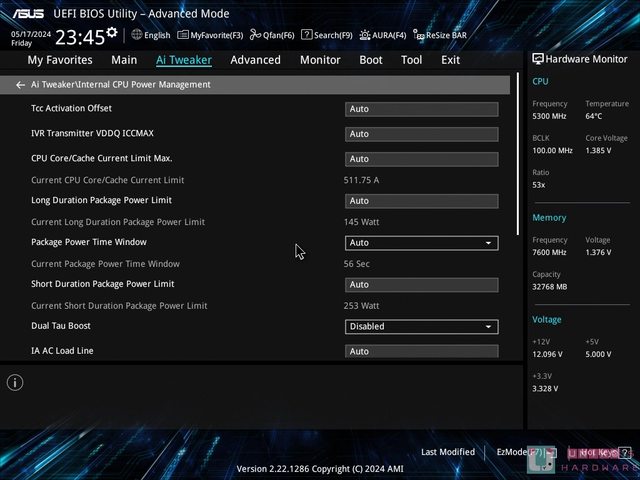 OS 預設狀態:PL1 = 145W、PL2 = 253W、TAU = 56、ICCMAX 511.75A (無限)、TDC 無限、