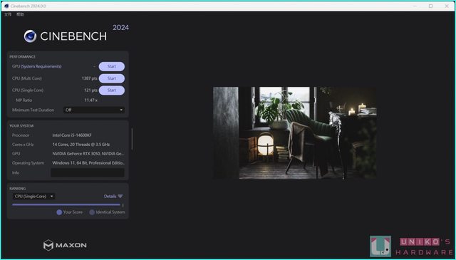 ‧ Cinebench 2024 單核心 121 pts,多核心 1387 pts。