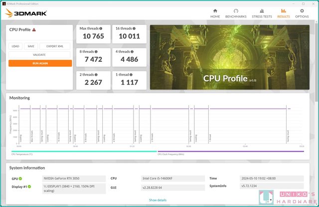 3DMARK CPU Profile,針對處理器的測試項目,6 個測試分別使用 1、2、4、8、16、或最