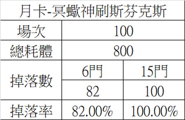標題[統計]月卡-冥蠍神刷斯芬克斯 100場掉落統計