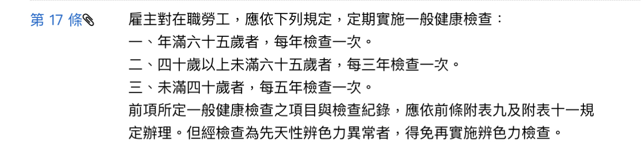 → ihooderm3200: 有打去勞動部問過說法規規定在職員工體檢一律由雇主 02/28 17:30