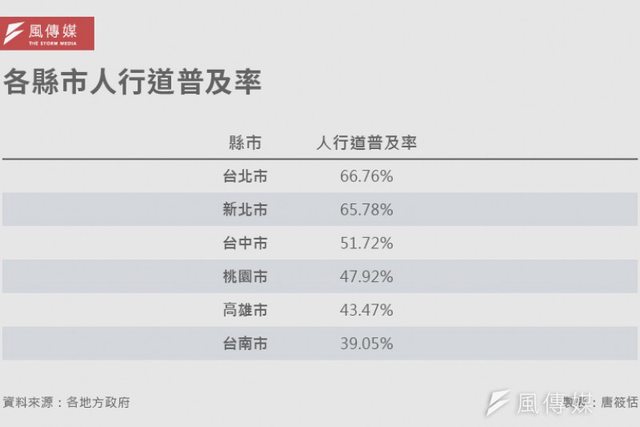 其中首善之都台北市、新北市人行道普及率各有66.76%與65.78%;六都最低則是