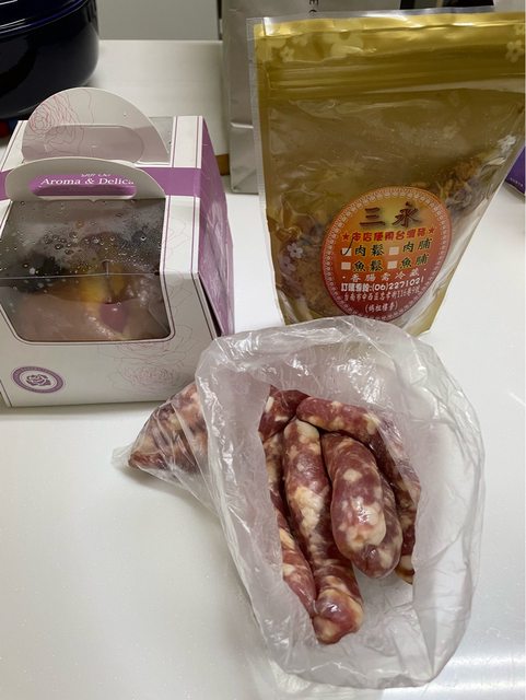 包含1包肉鬆、1包生香腸、1盒小蛋糕