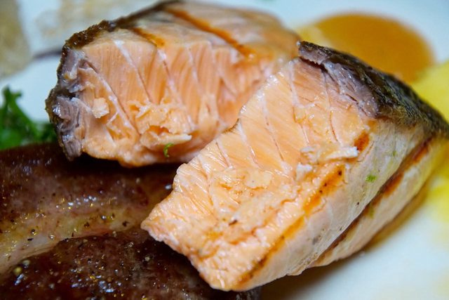 今天的第一道菜是伊比利豕梅花排並加購了鮭魚。伊比利豕的表面經過高溫煎烤後呈現出
