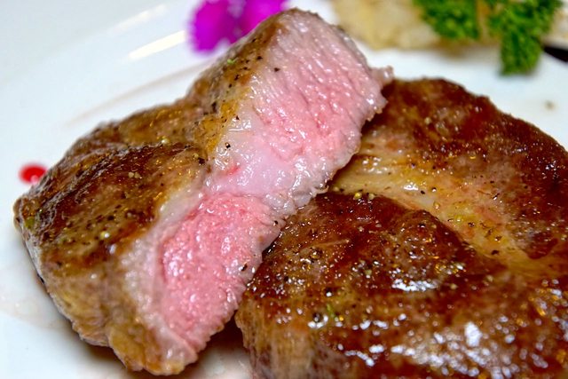 表面煎到帶著點交黃色,切開後滲出的肉汁令人垂涎欲滴。在五分熟的狀態下,吃起來肉