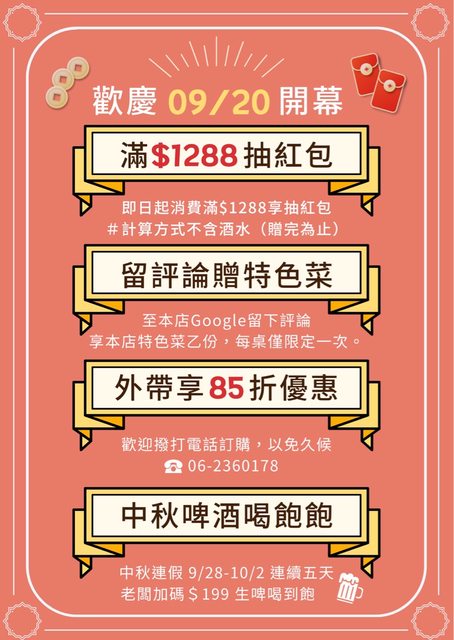 ====== \ 9/20開幕優惠/ ====== 1/ 消費滿$1288抽紅包(送完為止) 2/ 留評論贈送招牌菜一份 3/ 外帶85折 4/ 中秋連假9/28-10/2生啤$199喝到飽 ====== \ 推文加碼優惠/====== 在下面任意推文 10/2前到店消費 出示推文+FB按讚 即招待招牌菜一份 (=消費就送兩盤菜-0-??) ======================= 更多資訊歡迎追蹤他們! FB https://reurl.cc/x6EA8L IG https://reurl.cc/kaLgWn 地址:台南市東區中華東路二段82號 營業時間:每日17:30-01:30 電話:06-2360178 https://i.imgur.com/PwXGASN.jpg