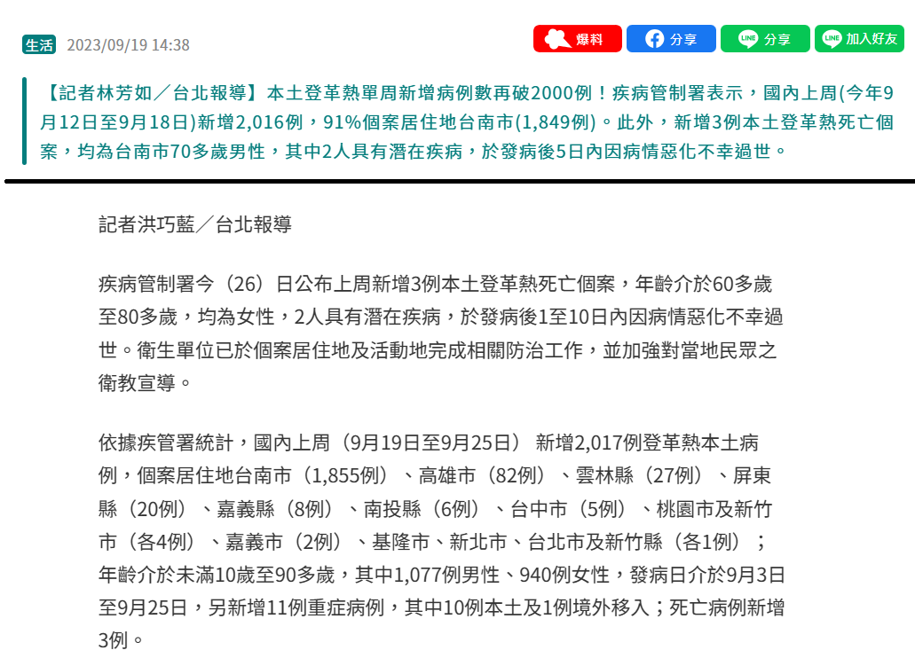 : 根據衛生局提出9月23至25日的新增病例數分別為261、197、323例與上周同期241、153、