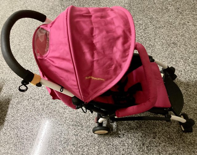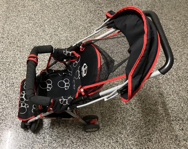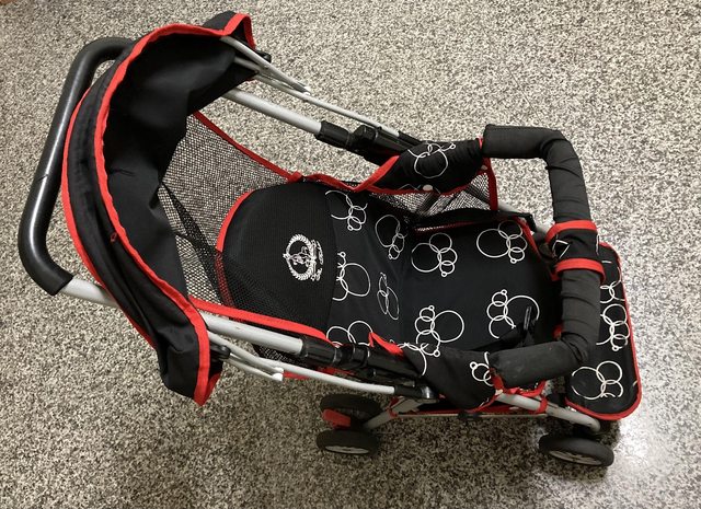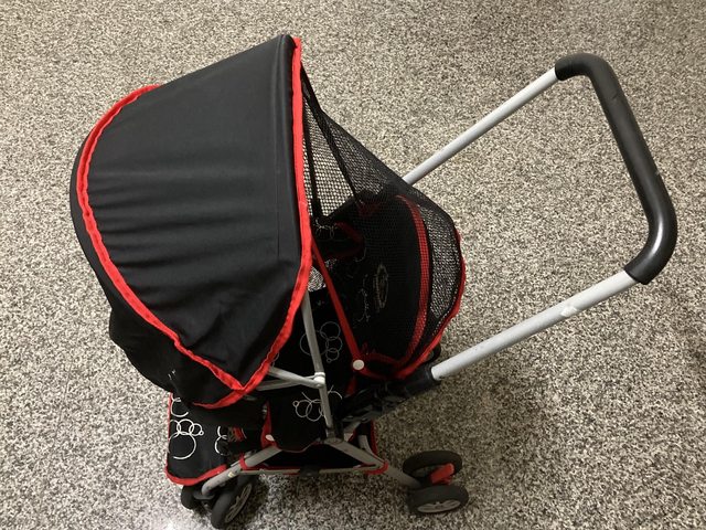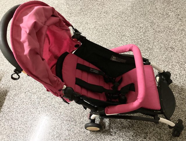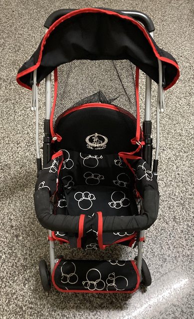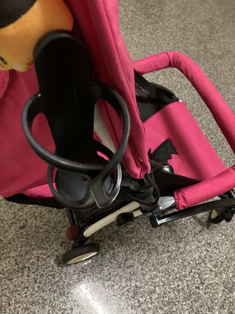 2、嬰兒車,可調整椅背傾斜角度,可折疊,遮陽棚可收合,底下有置物籃,附飲料杯架