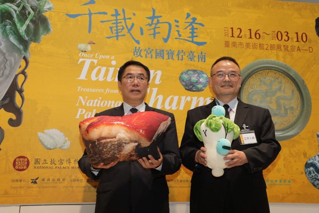 「千載南逢—故宮國寶佇台南」開箱見面會今舉行,拿著「控肉寶寶」的市長黃偉哲藏身