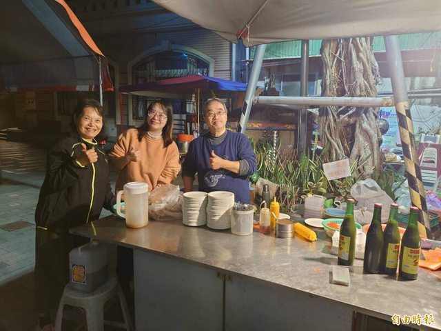 「沙淘宮鄭家菜粽」二代老闆蔡世南(右一)逐漸交棒給第三代的女兒鄭沛晴(中)。(