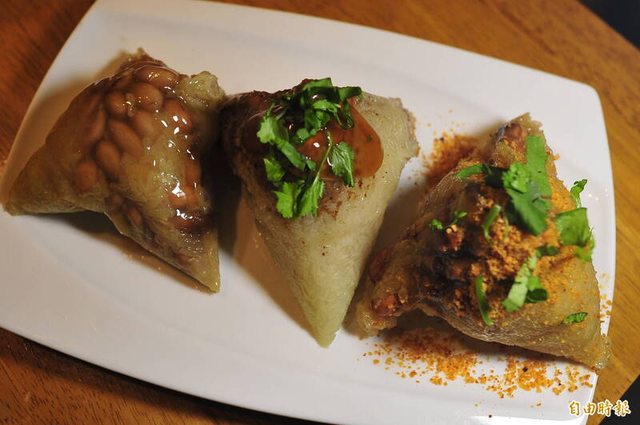 左起是沙淘宮鄭家菜粽、中間是明和菜粽、右邊是立人國小旁邊的老店肉粽、菜粽。(記