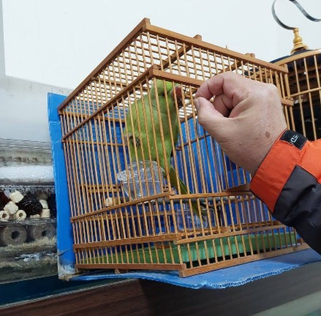 家人在公司拾獲到一隻綠色鸚鵡,經網友們確認是綠月輪。