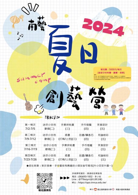 各位拔拔麻麻還在煩惱小朋友的暑季要如何度過嗎?【南藝夏日創藝營】提供周二至周四每日都不同的藝術課程,可以給小朋友滿滿充實的暑假生活,不論是要挖掘興趣、創意思考及藝術能力培養,【南藝夏日創藝營】都能滿足小朋友的好奇心與學習力。