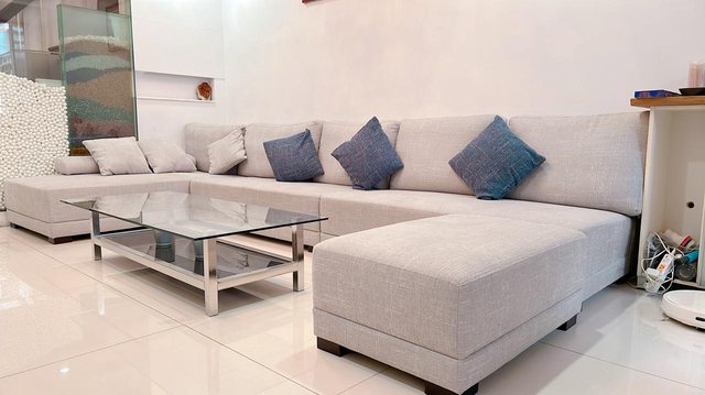 使用時間3、4年左右,一組沙發、3個灰色枕頭、3個藍色枕頭、一組茶几,全部一起帶,