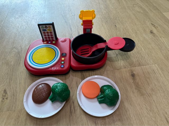 配件有:鍋子、鍋鏟、電話、瓦斯爐(鼓)、盤子、紅蘿蔔、花椰菜、肉片
