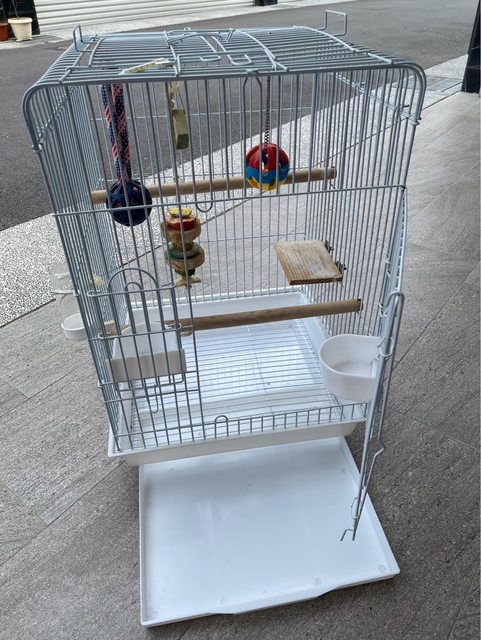 二手鳥籠,高68*長44*寬44公分,籠內附數個二手鸚鵡玩具,籠子有些許鏽痕物況7成新