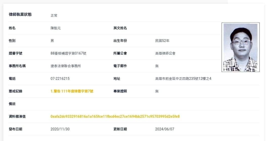 法公告,指該陳姓律師曾遭到律師懲戒委員會懲戒,不斷衍