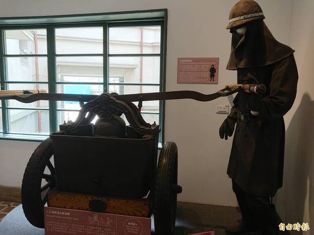 台南消防史料館展示人工消防汲水幫浦車與消防衣,是古董級消防設備。(記者洪瑞琴攝
