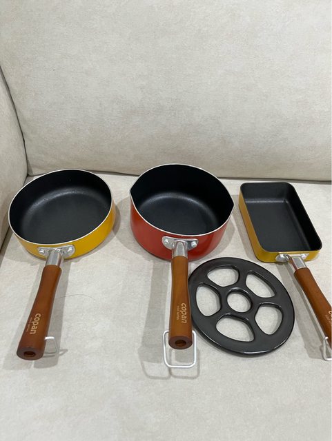 5玉子燒小鍋,三個含瓦斯爐架共$350,另送兩個大碗跟洗衣球。(都未使用過)