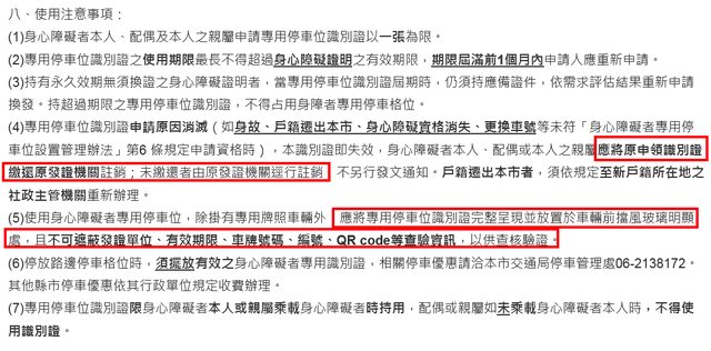 但是問題來了,台南市社會局的身心障礙者相關證件核發規定第八項第五款,八、使用注意