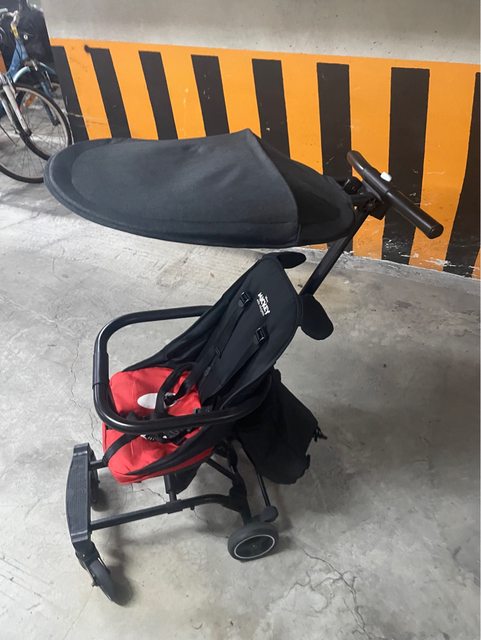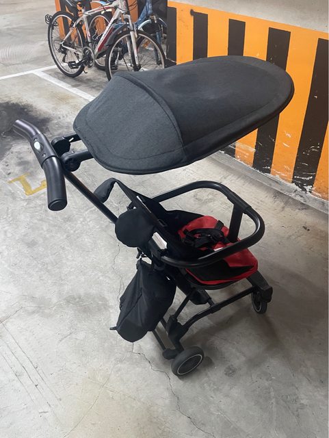 二手品。有附遮陽照(沒用過)。使用明顯痕跡就是坐墊的布(沒洗過)。其他都是完整