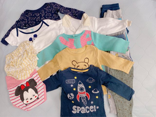 小孩衣物偏中性,也有女寶屁屁褲,尺寸約80公分,部分棉洗感明顯,適合粗穿。