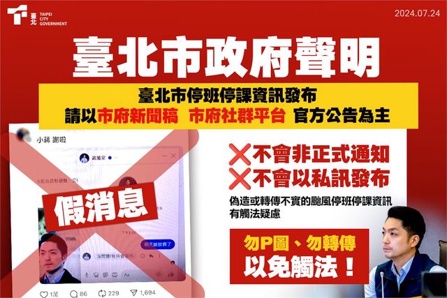 府強調,停班停課等重大市政消息發布,皆以官方新聞稿發