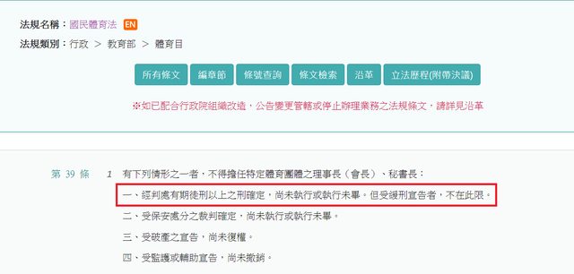 他揭露,現行國體法第39條所謂排黑條款根本無法杜絕協會的選務弊案。