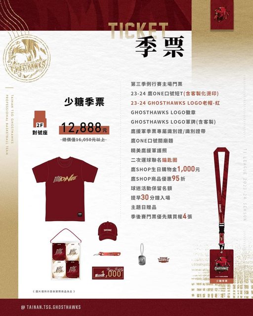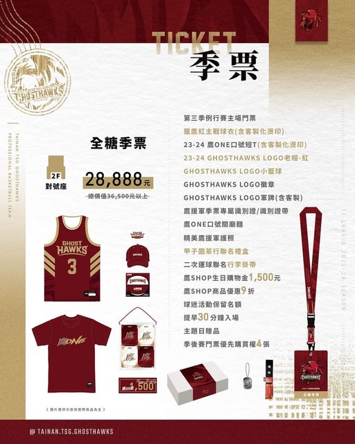 成為季票會員好康多多福利滿滿!客製化燙印主戰球衣、口號短T、甲子園茶行聯名禮盒、二次運球聯名行李掛袋以及今年新增的「鷹援軍護照」,全新更豐富的贈品內容機會難得!跟著南人們一起成為奪冠之路的夥伴吧