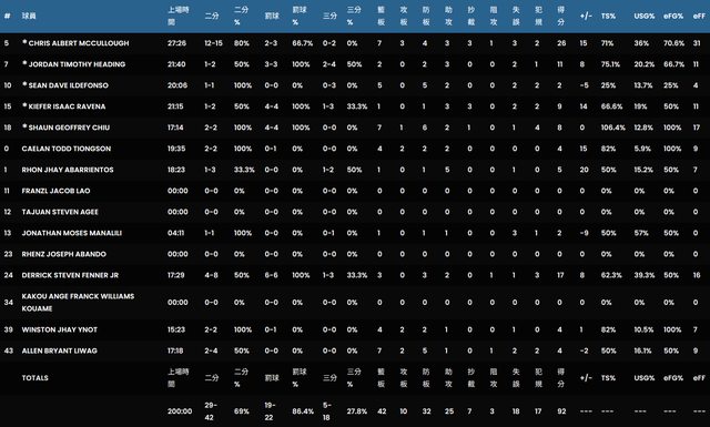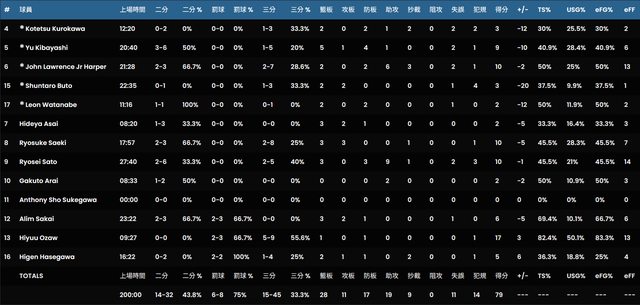 球 員 時 間 2PT 3PT FT OR DR TR AS ST BK TO PF PTS EFF +/- TS%