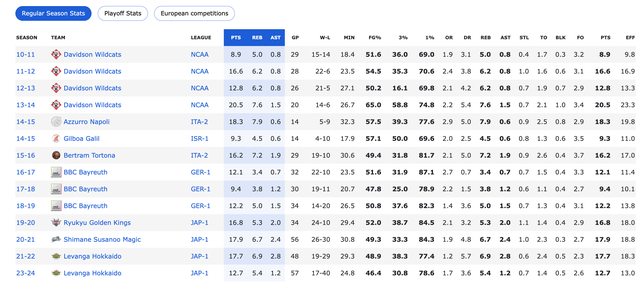 NCAA一級學校戴維森學院(Davidson College),大二和大四賽季分別以場均16.6分、