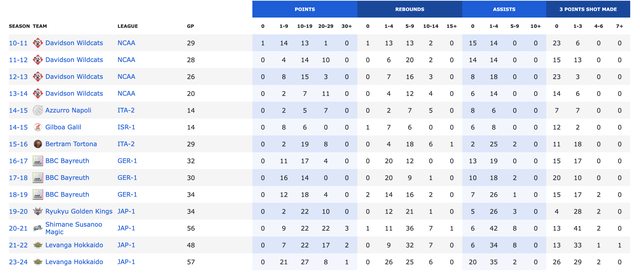 北海道神風隊,場均貢獻12.7分、5.4籃板及1.2次助攻。