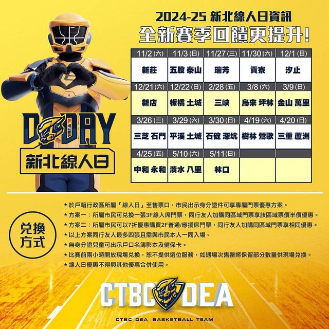 TPBL 2024-25新北中信特攻主場例行賽單場門票資訊