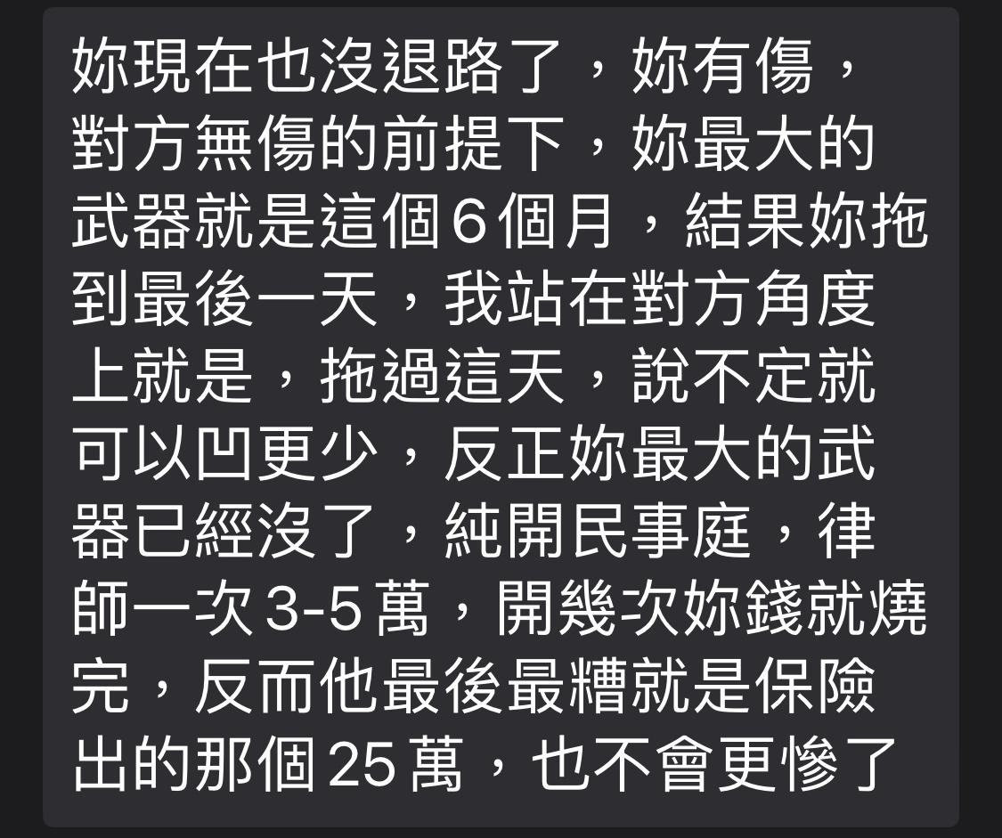 holsety: 傷害告訴下去,和解流程會快很多 111.255.207.97 04/24 15:44
