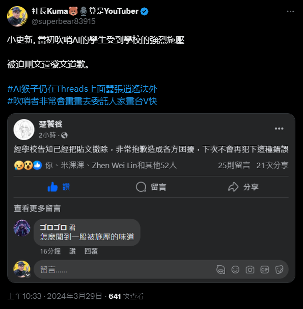 YUIatCMU: 學生小過沒問題 現在大家追殺的是學校 明知AI還硬凹是 04/01 16:41