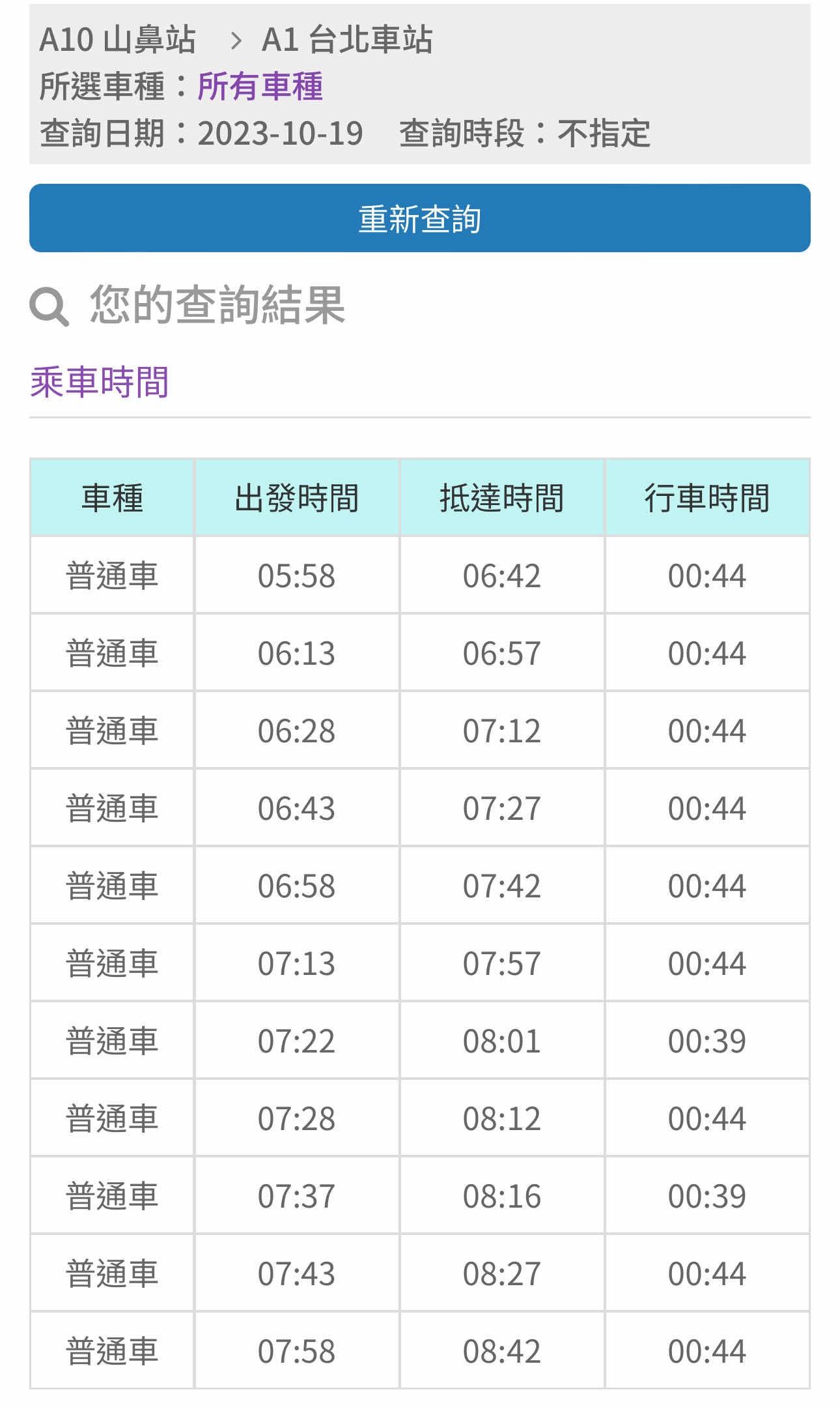 班車,07:52從A10山鼻站發車,08:31抵達A1台北車站,也是站站皆停的普通車。