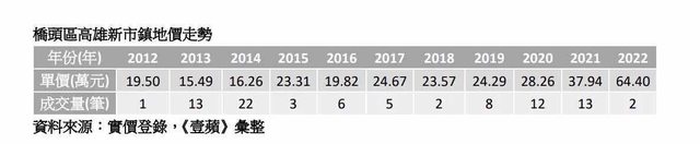 《壹蘋新聞網》依據實登統計,近年來高雄新市鎮地房價不斷上揚,區段地價從2016年每